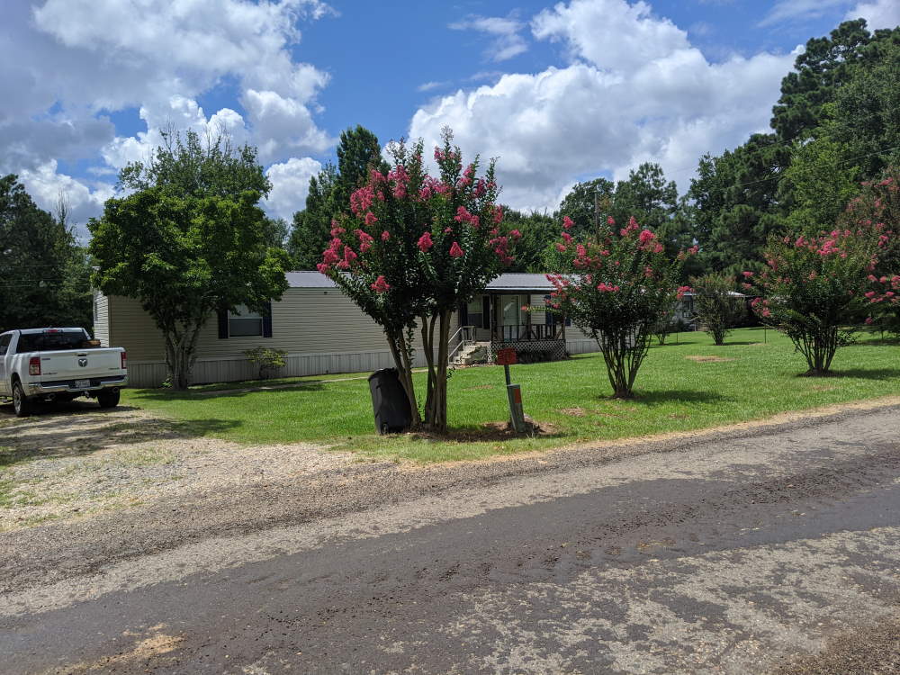 Simple house with an enhancement of Crape Myrtles along the public roadway.